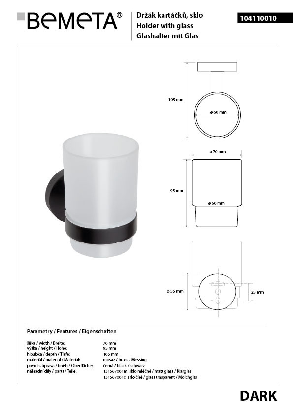 BEMETA Porte-verre DARK en laiton noir et en verre 7x9,5x10,5cm (104110010)