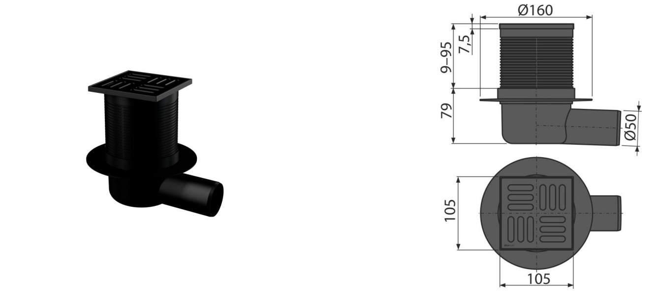Alca Drain de sol 105×105/50 mm sortie latérale, grille en acier inoxydable noir-mat, piège à odeurs combiné SMART (APV31BLACK)