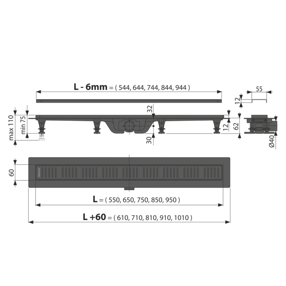 - Alca Caniveau de douche 650 mm avec grille, noir mat (APZ10BLACK-650M)