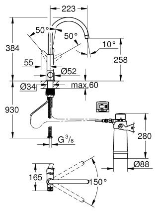 Caractéristiques du Kit de démarrage avec Mitigeur bec pivotant, Chrome Grohe Blue Pure BAUCURVE (30385000) :