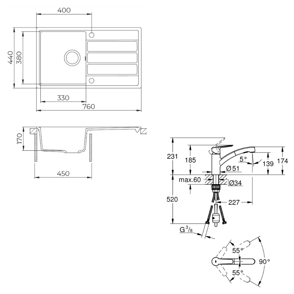 Caractéristiques de l'évier 76x44 cm avec égouttoir réversible en granite à encastrer + mitigeur Grohe monocommande avec douchette extractible, noir mat (SATSINKGE3B-SET) :