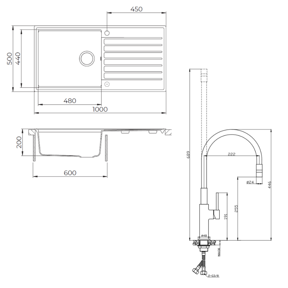 Caractéristiques de l'évier 100x50 cm avec égouttoir réversible en granite à encastrer + mitigeur aérateur Neoperl®, Swiss Aqua Technologies (SAT), noir mat (SATSINKGQK103B-S1) :