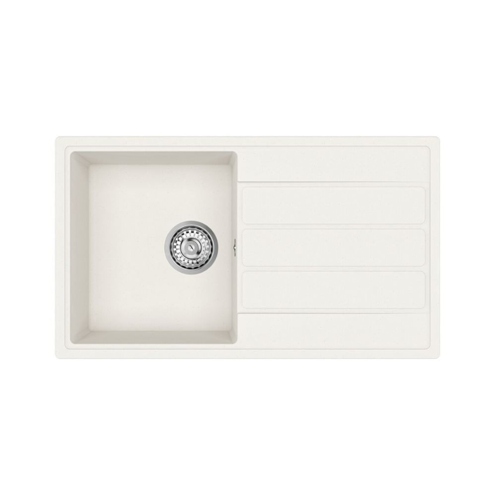 Caractéristiques de l'évier 76x44 cm avec égouttoir réversible en granite à en castrer + mitigeur avec douchette 2 jets, Swiss Aqua Technologies (SAT), blanc (SATSINKGE3W-SET1) :