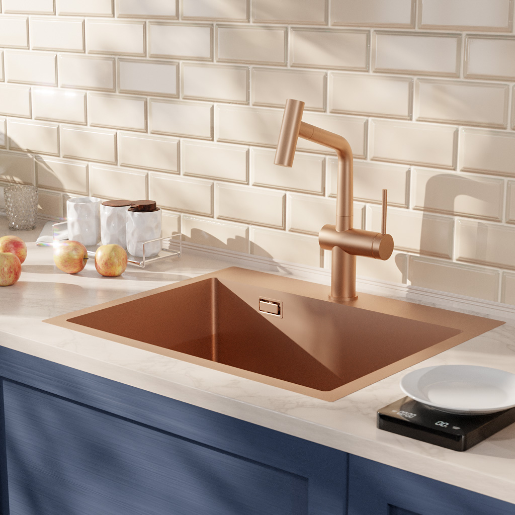 Caractéristiques de l'évier encastrable 55x45x21 cm en inox 304, 1 bac + mitigeur d'évier à levier en acier inoxydable avec douchette extractible, monotrou, Ceramia Timeless, cuivre brossé (TMLKST-5545BCP-M1) :