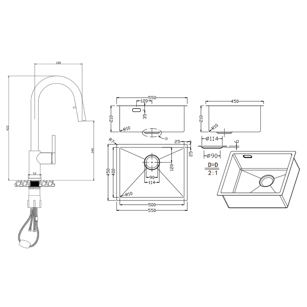 Caractéristiques de l'évier de cuisine sous plan 55x45x21 cm en inox 304, 1 bac + mitigeur d'évier à levier en acier inoxydable avec douchette extractible, monotrou, Ceramia Timeless, cuivre brossé (TMLKSU-5545BCP-M2) :