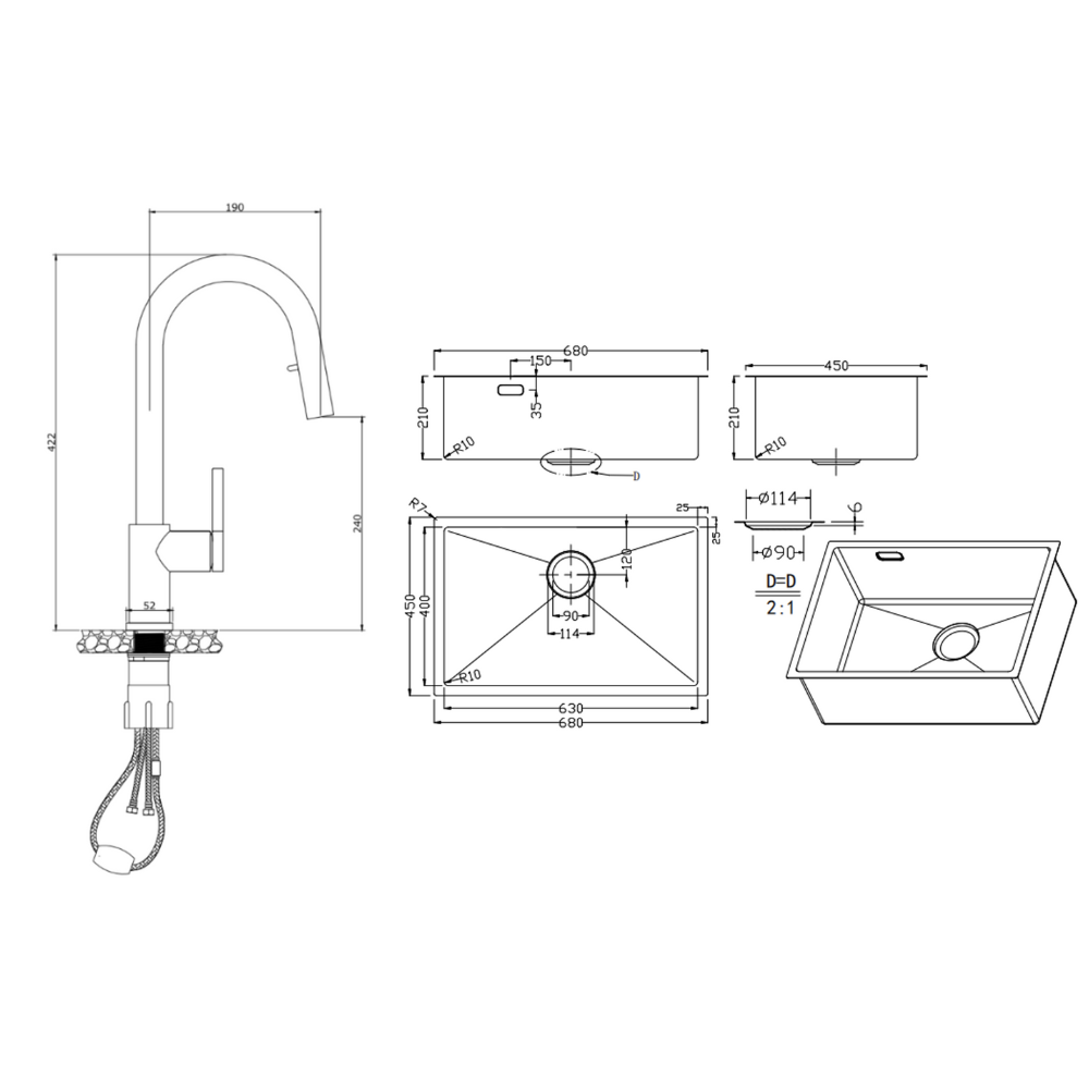 Caractéristiques de l'évier sous plan 68x45x21 cm en inox 304, 1 bac + mitigeur d'évier à levier en acier inoxydable avec douchette extractible, monotrou, Ceramia Timeless, cuivre brossé (TMLKSU-6845BCP-M2) :