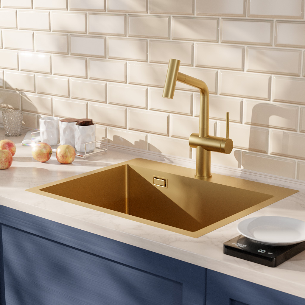 Ceramia Timeless 55x45x21 cm évier encastrable en inox 304 + mitigeur inox avec douchette extractible, or brossé (TMLKST-5545BG-M1)