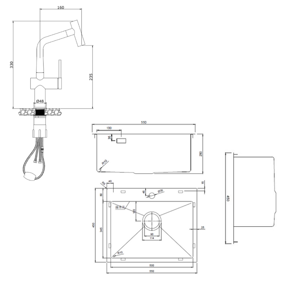 Caractéristiques de l'évier de cuisine encastrable 55x45x21 cm en inox 304, 1 bac + mitigeur d'évier à levier en acier inoxydable avec douchette extractible, monotrou, Ceramia Timeless, gun metal brossé (TMLKST-5545BGM-M1) :
