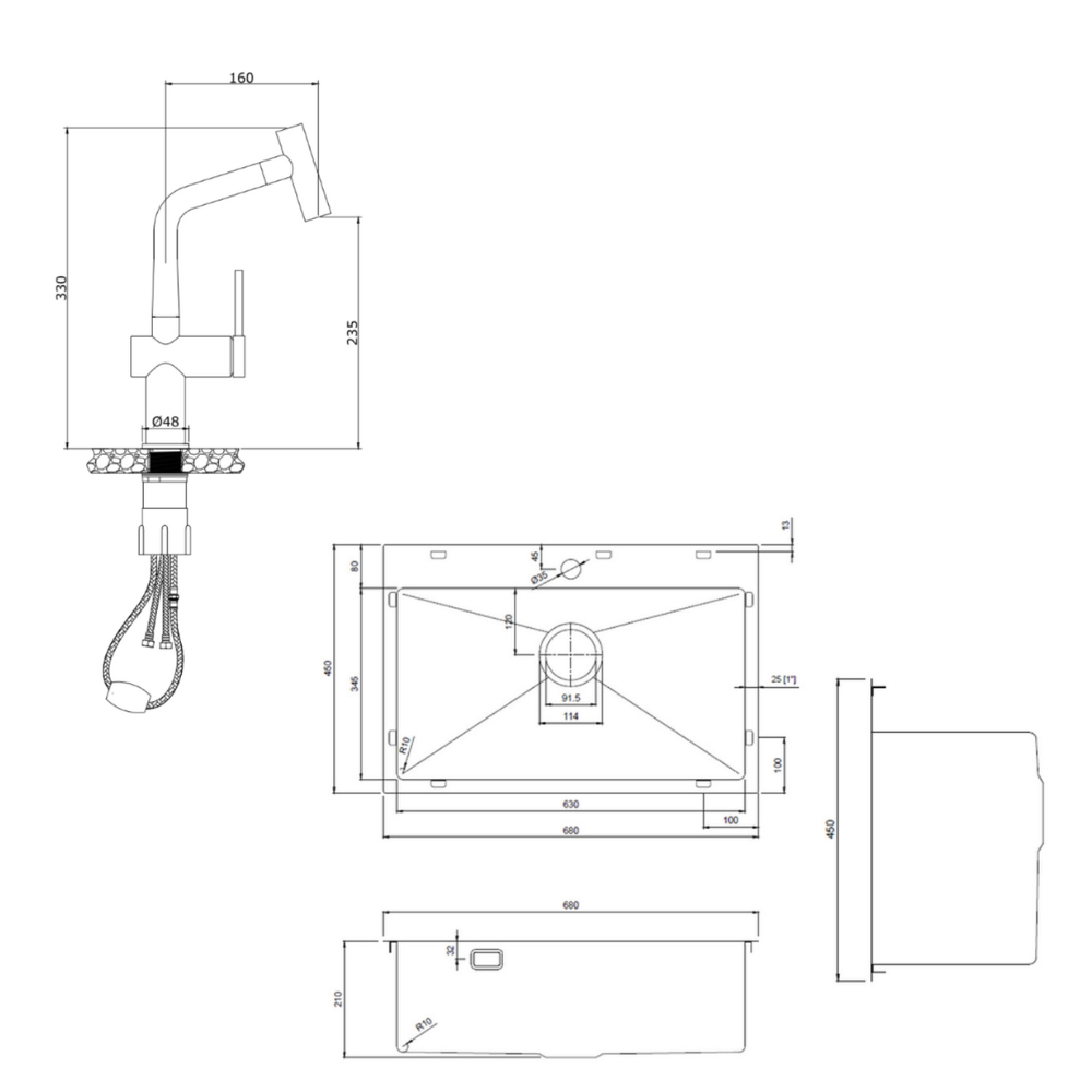Caractéristiques de l'évier de cuisine encastrable 68x45x21 cm en inox 304, 1 bac + mitigeur d'évier à levier en acier inoxydable avec douchette extractible, Ceramia Timeless, gun metal brossé (TMLKST-6845BGM-M1) :