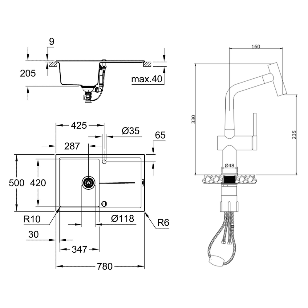 Caractéristiques de l'évier en quartz composite avec égouttoir réversible 780x500 mm Grohe K400 + Ceramia Timeless mitigeur (G31639TML1BGM-SET) :