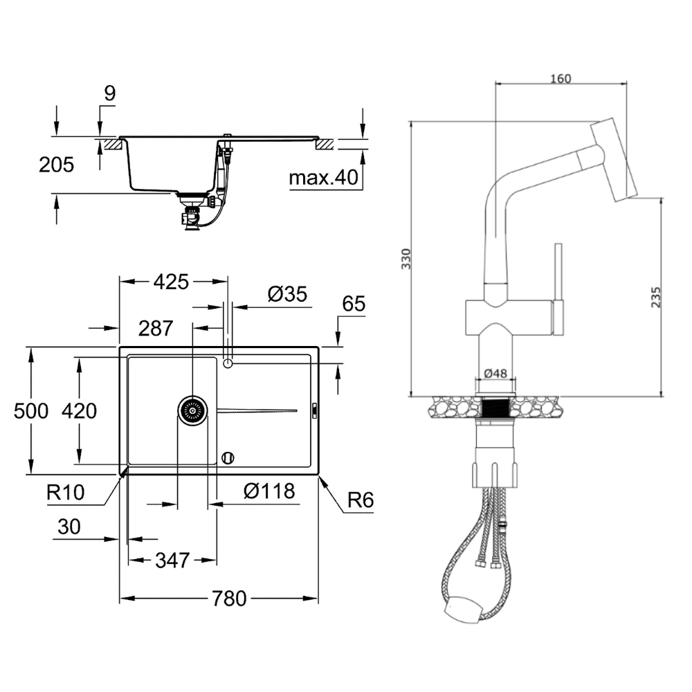 Caractéristiques de l'évier en quartz composite avec égouttoir réversible 780x500 mm Grohe K400 + Ceramia Timeless mitigeur (G31639TML1BCP-SET) :