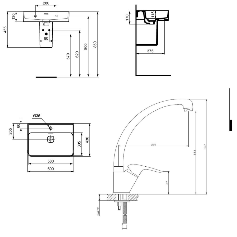 Caractéristiques du lavabo 600x430 mm 1 trou Ideal Standard Strada II + Ideal Standard S-Line Pro mitigeur avec bec pivotant, chrome (T300001SBSLPRO281) :