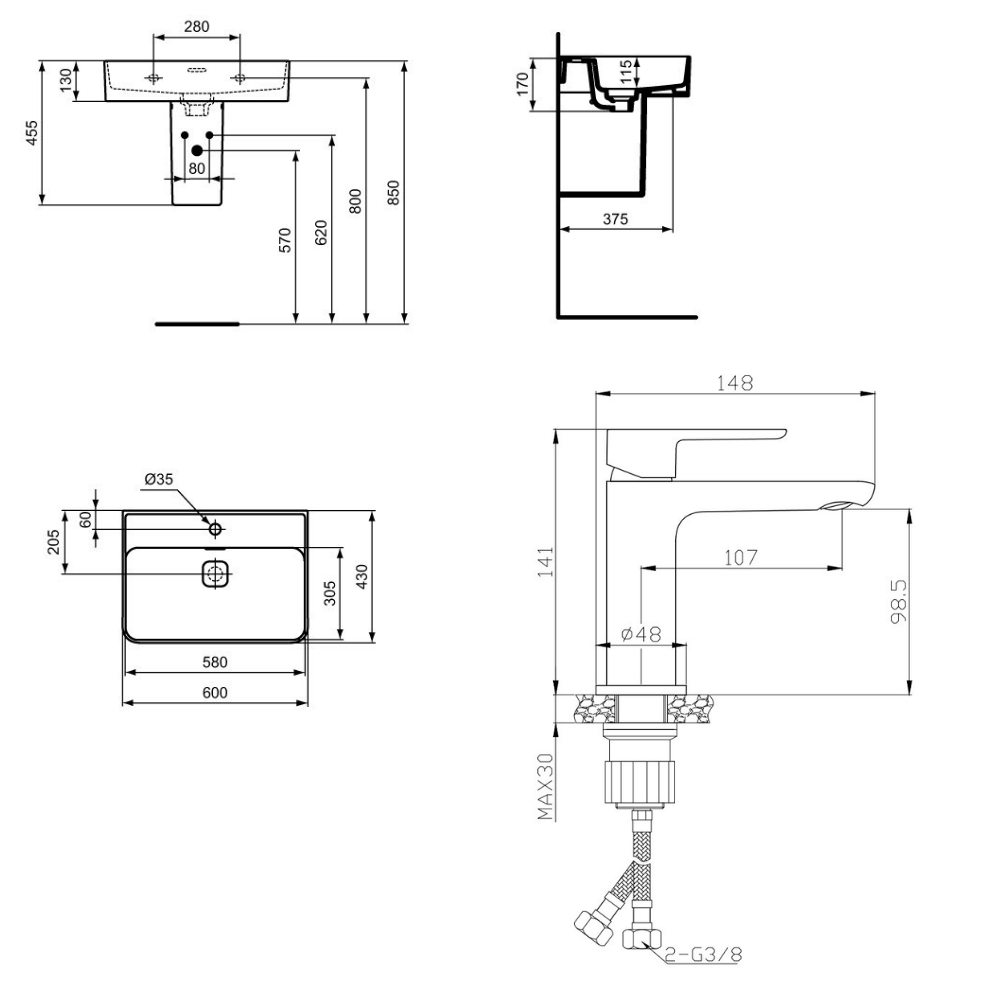 Caractéristiques du lavabo 600x430 mm 1 trou Ideal Standard Strada II + Swiss Aqua Technologies Mood mitigeur lavabo avec levier sans tirette, chrome (T300001SATBSM271) :