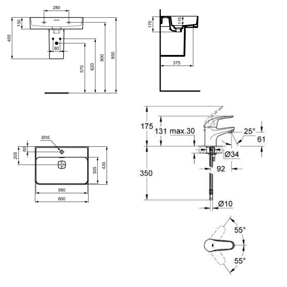 Caractéristiques du lavabo 600x430 mm 1 trou Ideal Standard Strada II + Grohe Euroeco mitigeur monocommande lavabo 1/2", chrome (T300001G32734000) :