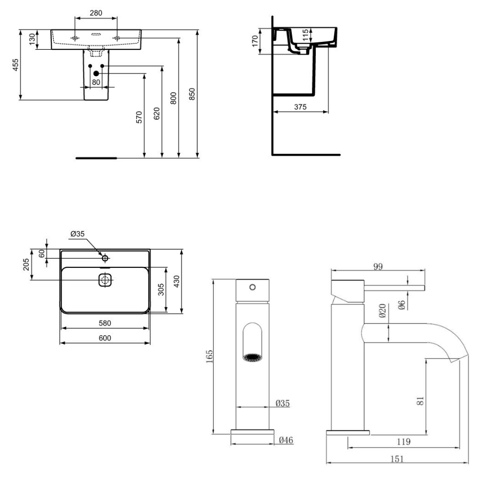 Caractéristiques du lavabo 600x430 mm 1 trou Ideal Standard Strada II + Swiss Aqua Technologies Aurum mitigeur lavabo sur pied, sans vidage, noir mat (T300001SAT271BGM) :