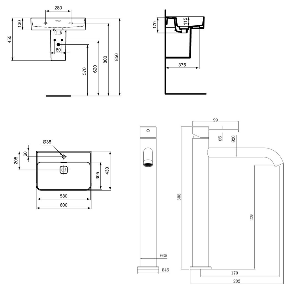 Caractéristiques du lavabo 600x430 mm 1 trou Ideal Standard Strada II + Swiss Aqua Technologies Aurum mitigeur haut acier inoxydable, sans vidage, chrome (T300001SAT285CR) :