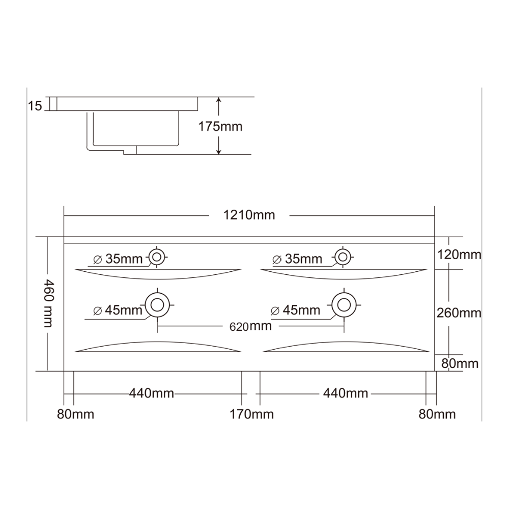 - Nombre de trous pour la robinetterie : 2 au milieu