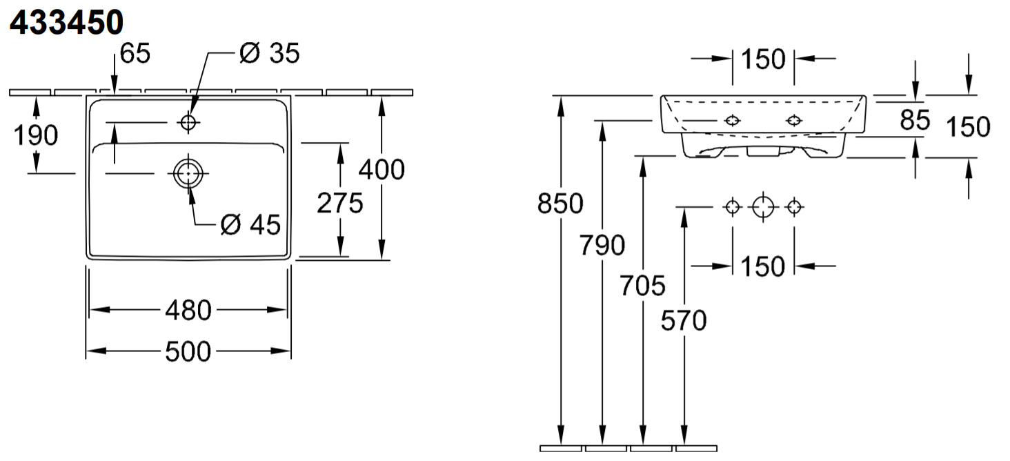 Caractéristiques du Lave-mains rectangulaire fixation murale 50x40cm, avec trop-plein, Stone White CeramicPlus Villeroy&Boch Collaro (433450RW) :