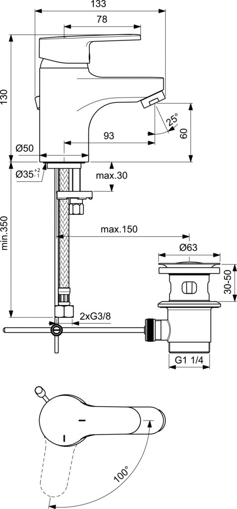 - Hauteur sous aérateur 60 mm. Projection 93 mm