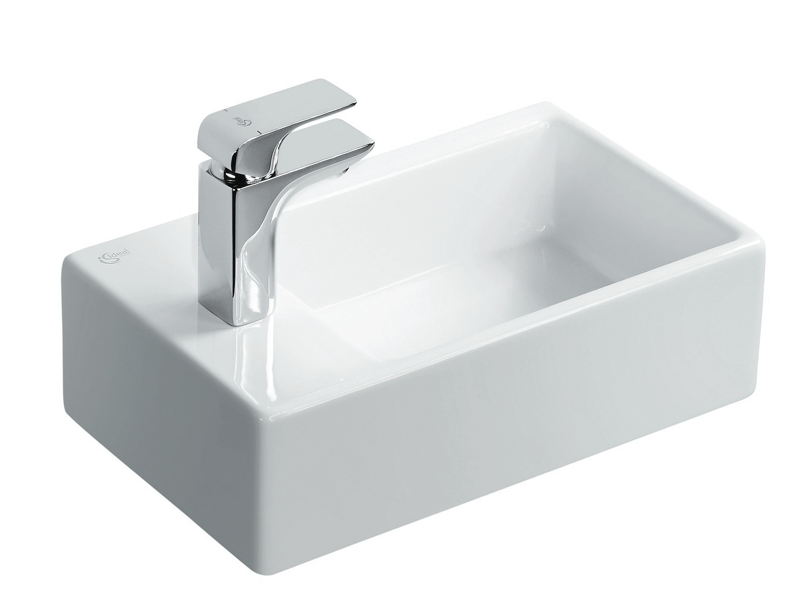 - Lave-mains de forme rectangulaire avec une plage arrière plane équipée d'un trou de robinetterie à gauche.