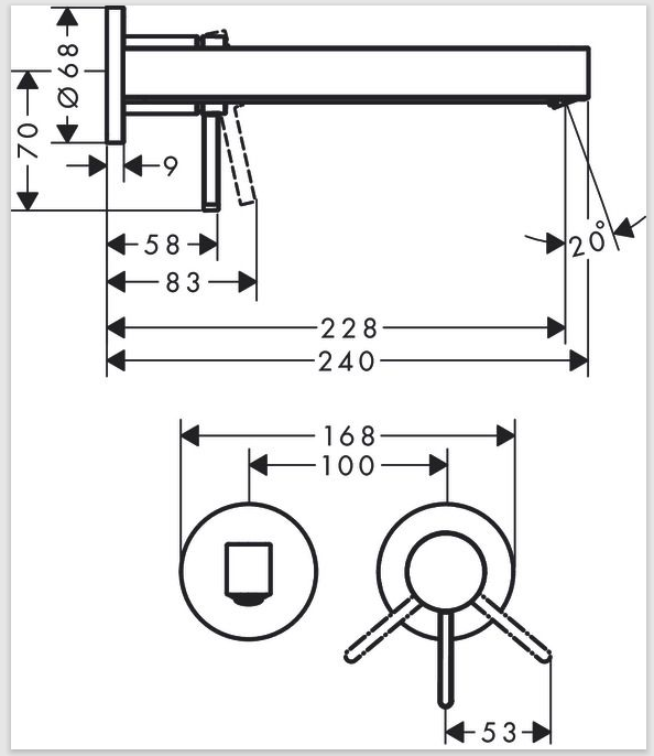 Saillie du bec : 228 mm (distance entre le mur et le mousseur).