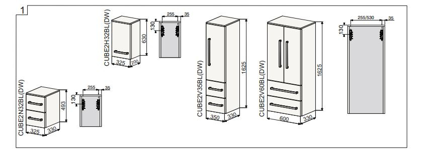 Meuble haut supplémentaire pour la salle de bain avec une porte et deux tiroirs. Deux étagères intérieures. La porte peut être tournée pour changer l'ouverture vers la gauche/droite. Les tiroirs ont une extension totale avec butée.