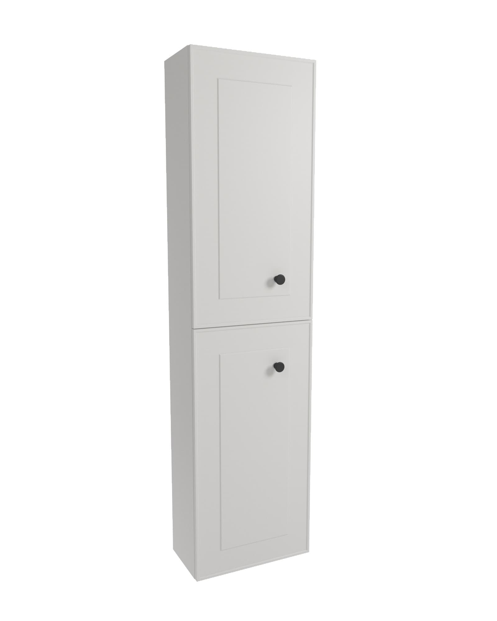 Meuble de salle de bain suspendu haut en blanc de dimensions 40x157x20 cm. Ferme avec une porte. La porte a une ouverture à gauche et à droite.
