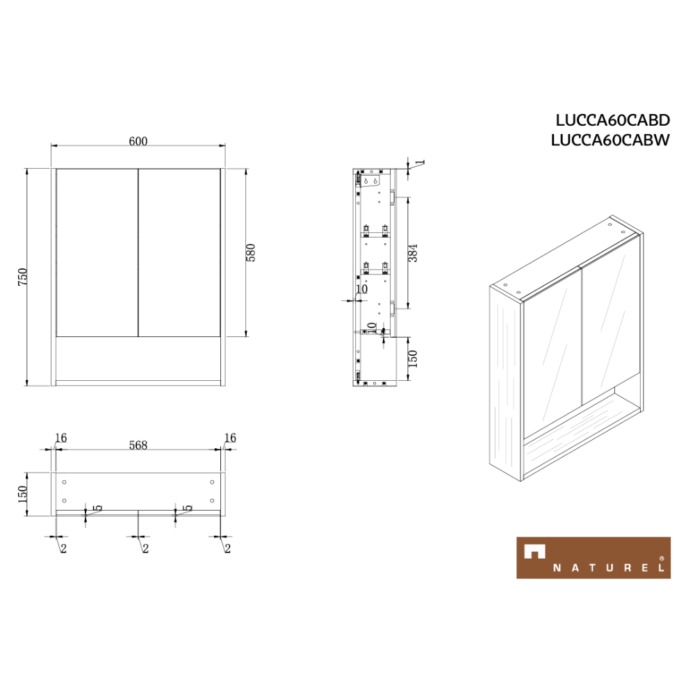 Caractéristiques de l'armoire de salle de bain assemblée 60x75 cm, stratifié, 4 étagères, miroir blanc, Naturel Lucca (LUCCA60CABW) :
