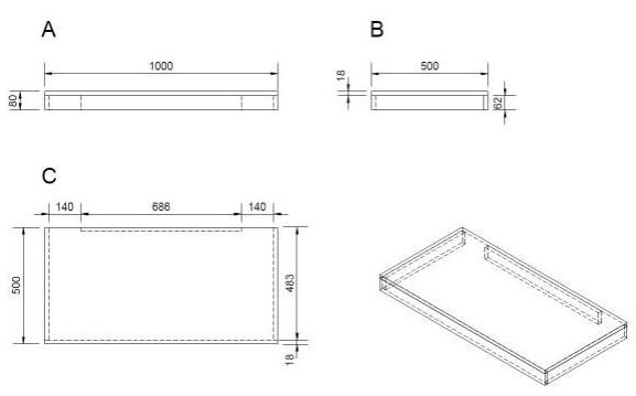 Plaque sous le lavabo. Le trou pour le vidage du lavabo doit être réalisé en fonction de la cuvette achetée. Les supports pour accrocher la planche au mur ne sont pas inclus dans la livraison. Les supports appropriés sont KONZOLEH et KONZOLEP.