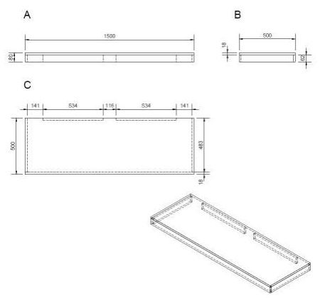 Plaque sous le lavabo. Le trou pour le vidage du lavabo doit être réalisé en fonction de la cuvette achetée. Les supports pour accrocher la planche au mur ne sont pas inclus dans la livraison