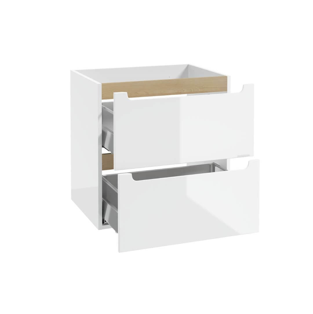 Meuble de salle de bain suspendu supplémentaire (sans découpe pour siphon) en blanc. Dimensions 60x60x45 cm. Face avant en mélaminé laqué. Le produit est livré démonté, avec instructions de montage.