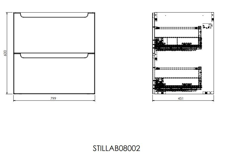 Meuble de salle de bain suspendu Stilla avec deux tiroirs de dimensions 80x60x45 cm. Le meuble fait partie de la collection modulaire et peut être combiné avec le plateau de la couleur de votre choix. En choisissant un plateau plus large que le meuble, il est possible de créer un agencement individuel en ajoutant d'autres meubles et des caissons de la collection. Cette solution vous permet d'obtenir plus d'espace de rangement pour tous les accessoires de salle de bain.