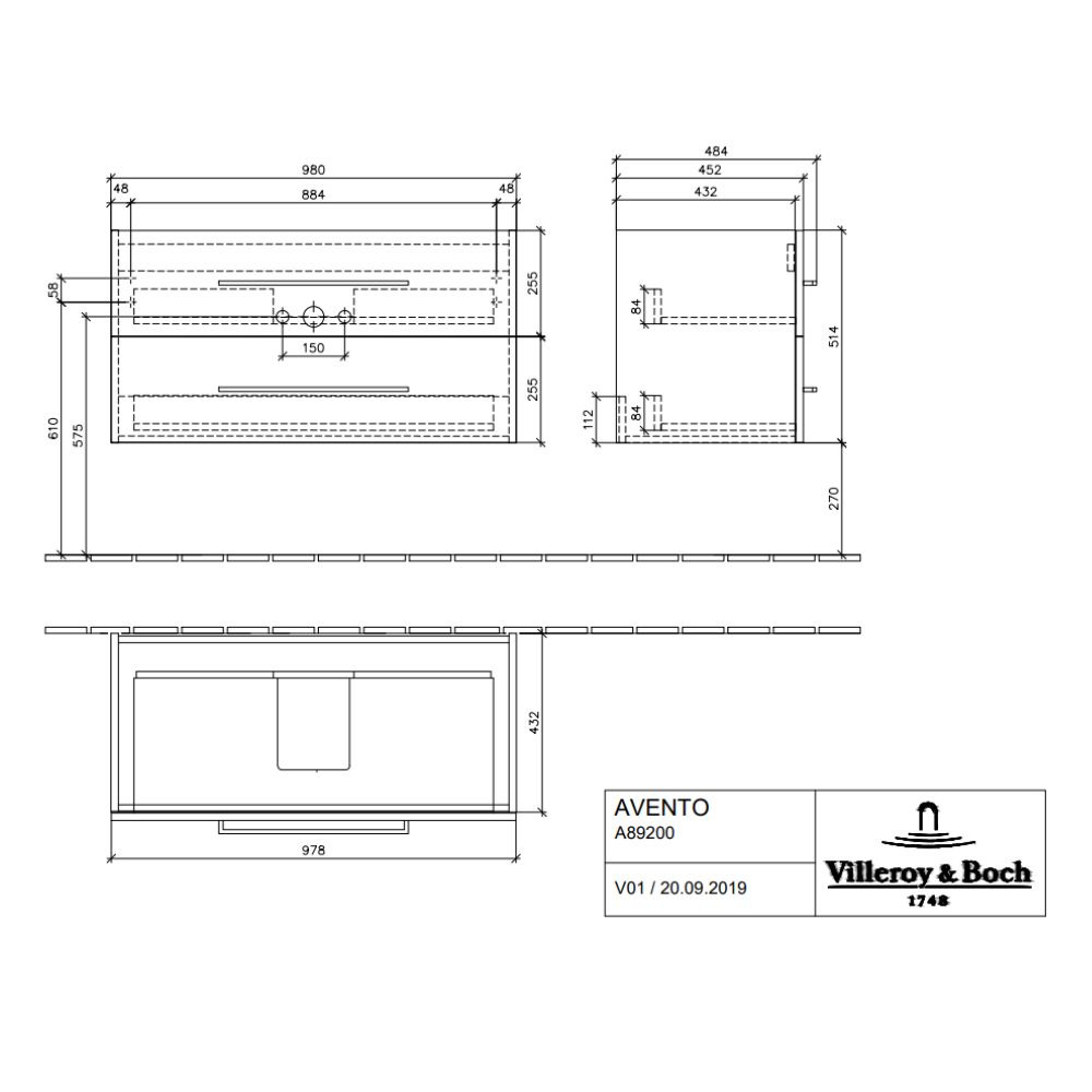 Villeroy & Boch Meuble sous plan Avento, 2 tiroirs sur rails, 980 x 514 x 484 mm, Crystal Grey (A89200B1)