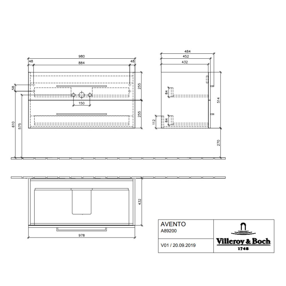 Villeroy & Boch Meuble sous plan Avento, 2 tiroirs sur rails, 976 x 514 x 484 mm, Oak Kansas (A89200RH)
