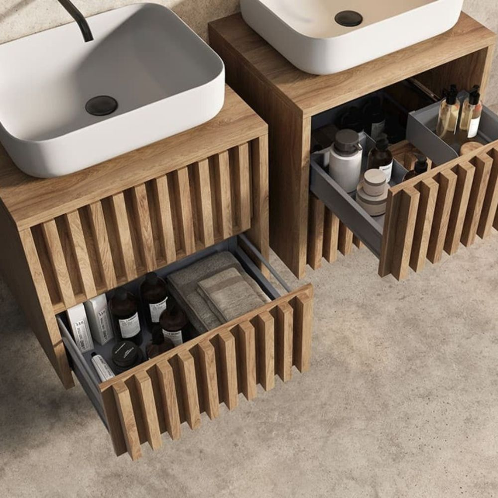 Nous vous présentons notre nouveauté, le meuble vasque de salle de bain SAT Delano en chêne mat. Ce meuble n'est pas seulement un élément pratique et fonctionnel de votre salle de bain, mais apporte également à votre intérieur une touche de design d'intérieur contemporain - lattes verticales.