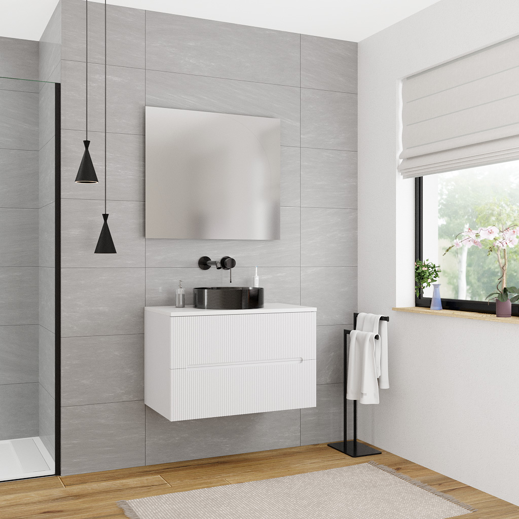 Sa finition blanc mat à rainures verticales s’inscrit dans une tendance minimaliste qui s’harmonise avec tous les styles de décoration. Que vous l’associiez à une vasque à poser ou à un miroir rétroéclairé, ce meuble salle de bain 80 cm est un atout design et pratique pour moderniser votre espace.