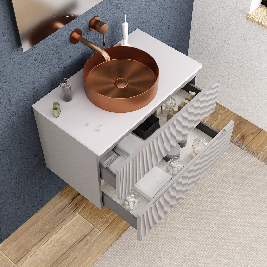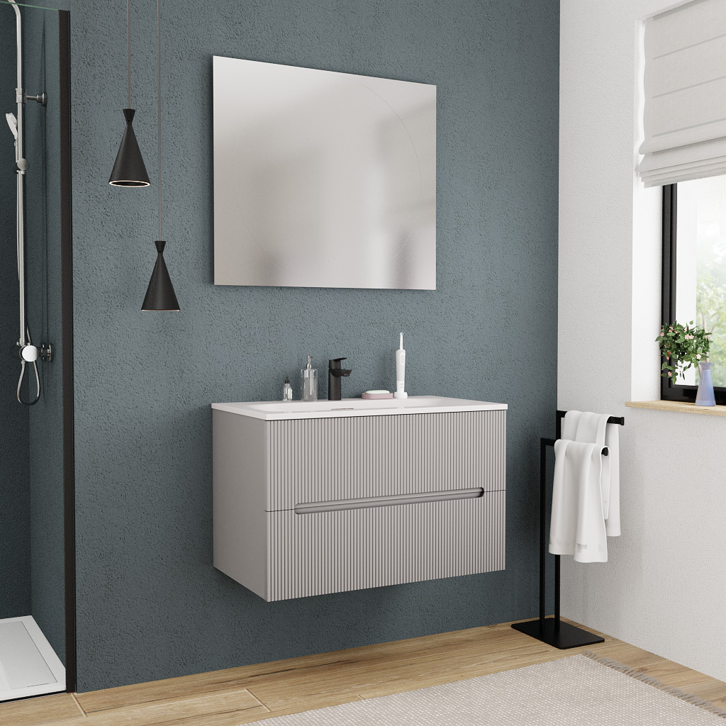 Alliez style doux et fonctionnalité intelligente avec le meuble de salle de bain Ceramia 80 cm en gris perle, idéal pour sublimer une salle de bain moyenne tout en maximisant le rangement. Ce meuble suspendu à deux tiroirs associe design contemporain, rangements généreux et matériaux durables, avec une finition mate au ton subtil qui s’adapte à tous les univers décoratifs.