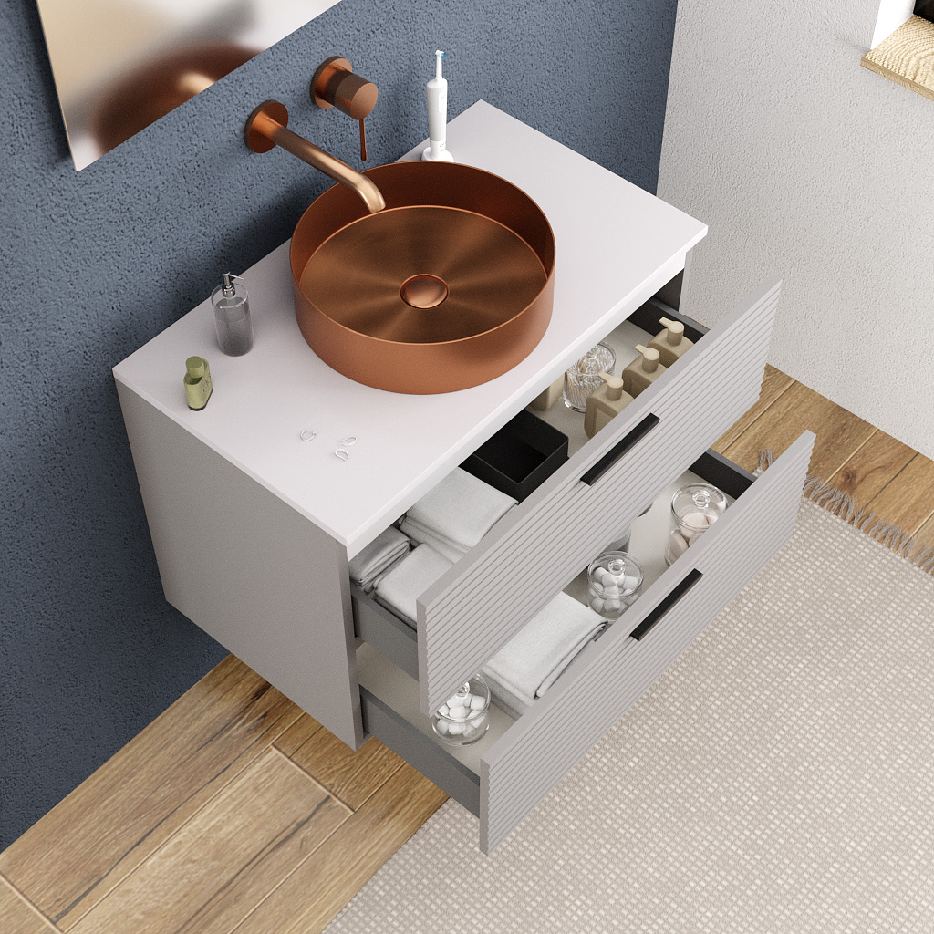 Avec ses façades striées, son coloris doux et lumineux, et sa structure robuste en MDF, ce meuble vous permet d’optimiser l’espace sans faire de compromis sur le design. Le plan vasque, non percé mais préperforé, vous laisse le choix d’installer un mitigeur mural ou sur plan.