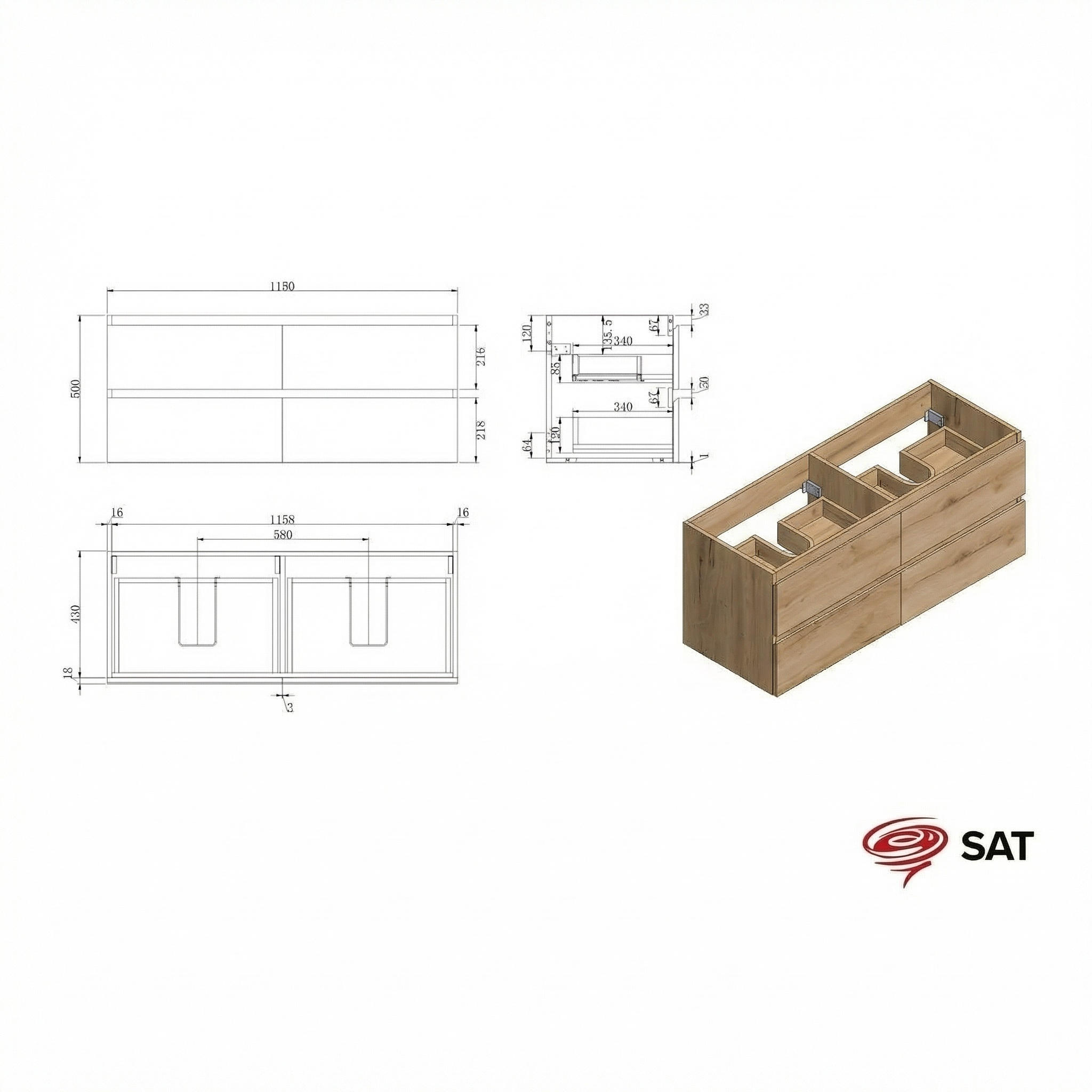 Caractéristiques du meuble de salle de bain suspendu sous vasque 119x50x45 cm, 4 tiroirs, Swiss Aqua Technologies B-Way, chêne mat (BWAY2120OAK) :