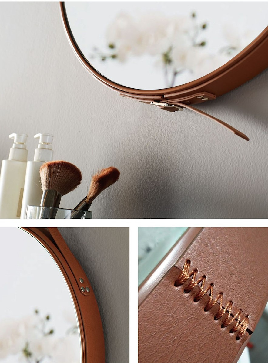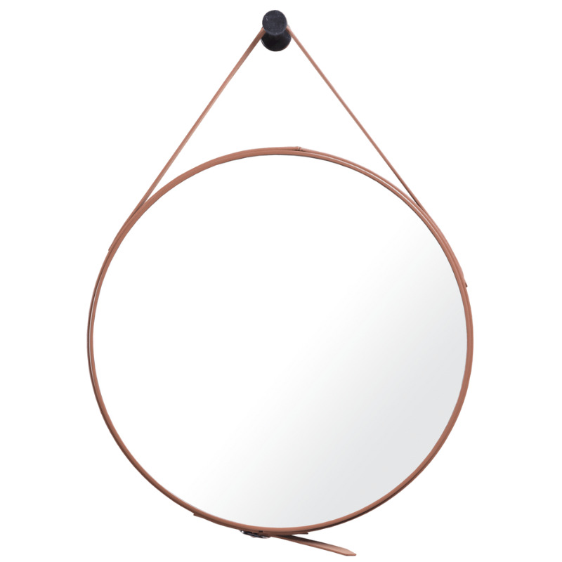 Naturel Miroir à suspendre rond 50x50 cm avec lanière en cuir, Marron (ZREM50H)