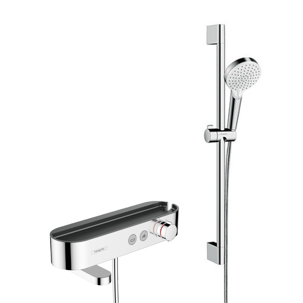 Hansgrohe Pack Mitigeur thermostatique bain/douche 400 avec tablette, bec déverseur rotatif + Set de douche 2 jets, Chrome