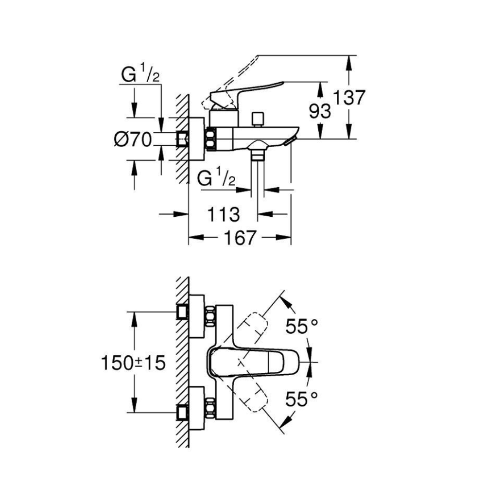 Caractéristiques du mitigeur monocommande bain/douche mural à levier 150 mm, sans ensemble de douche, Grohe Dice, noir mat (1018722430) :