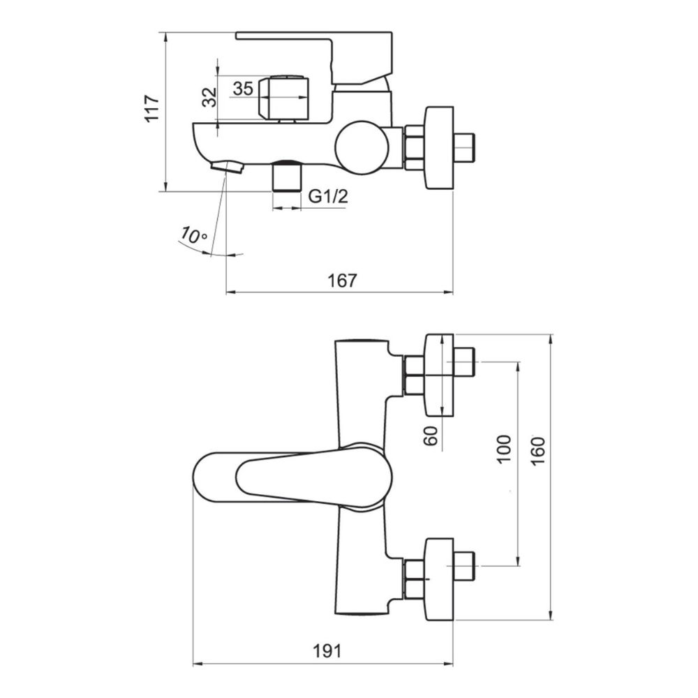 Ensemble Mural Robinet de bain sans douche. En finition chromée. Pas du robinet 100 mm. La hauteur du mitigeur est de 11,7 cm.