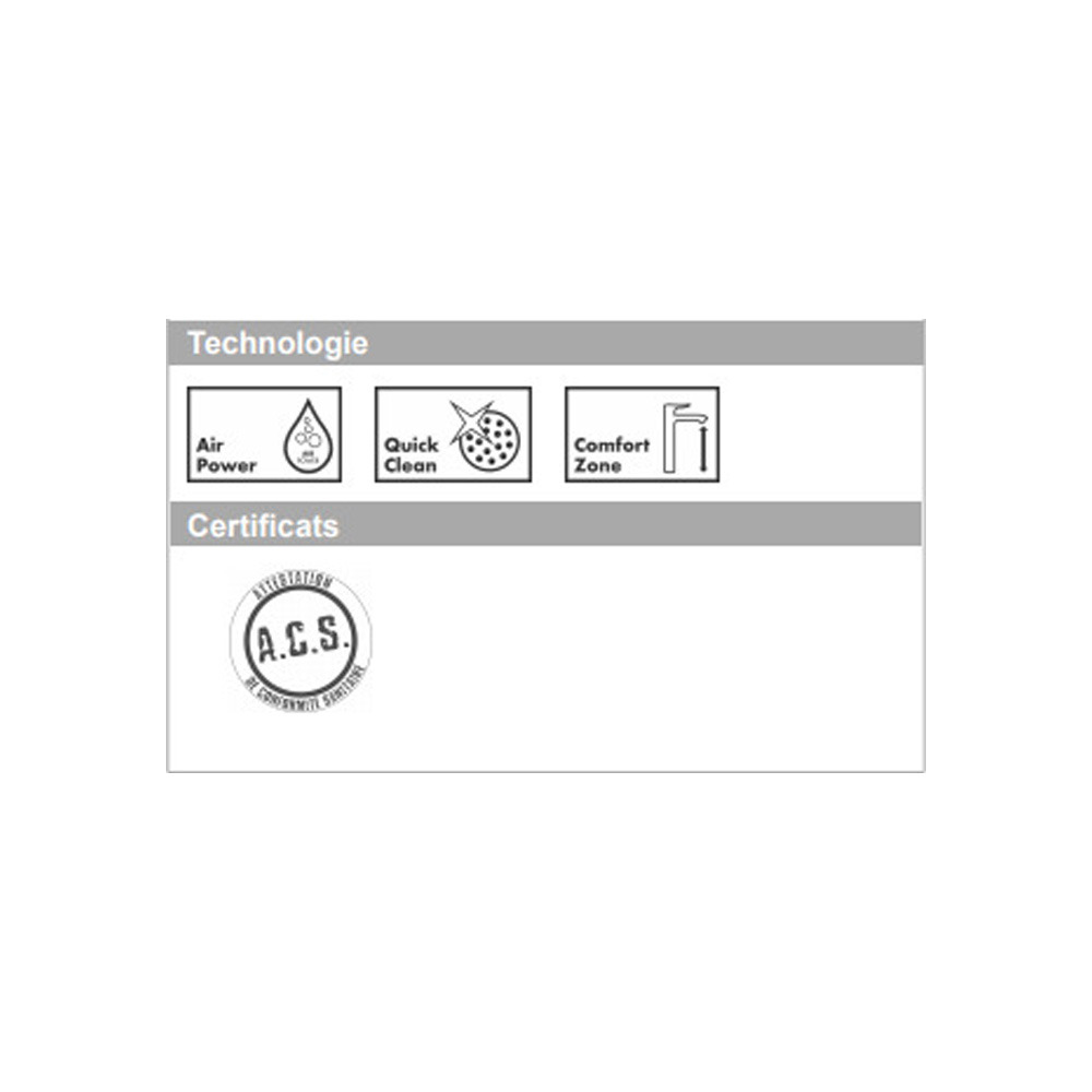 - AirPower Cette technologie permet un mélange optimal de l'eau et de l'air pour obtenir un jet doux sans éclaboussure et de fines gouttes généreuses. Le jet est parfaitement optimisé pour utiliser l'eau efficacement