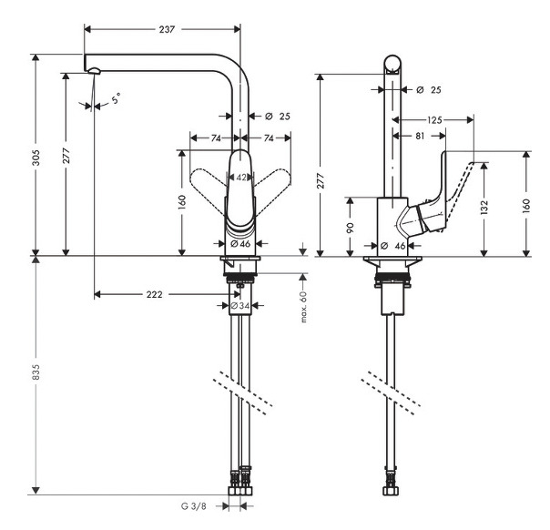 Caractéristiques du mitigeur de cuisine Hansgrohe 280 noir mat, 1 jet (31817670) :