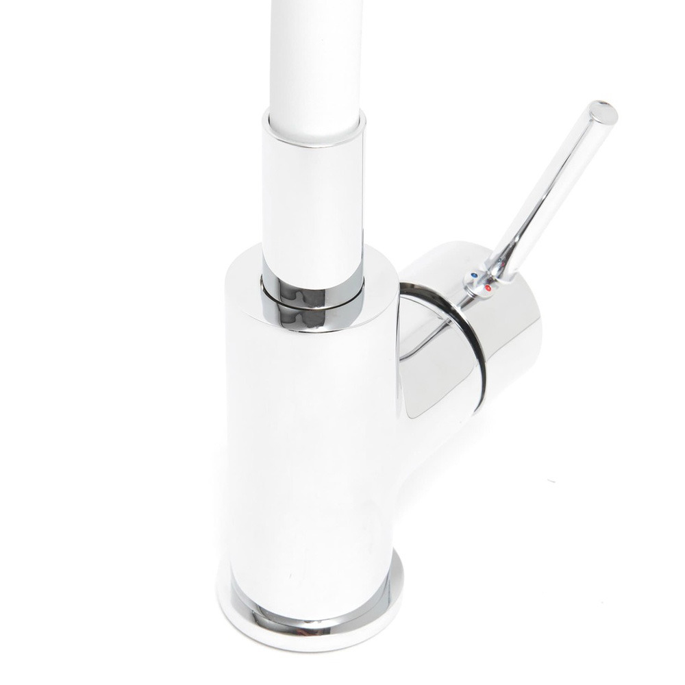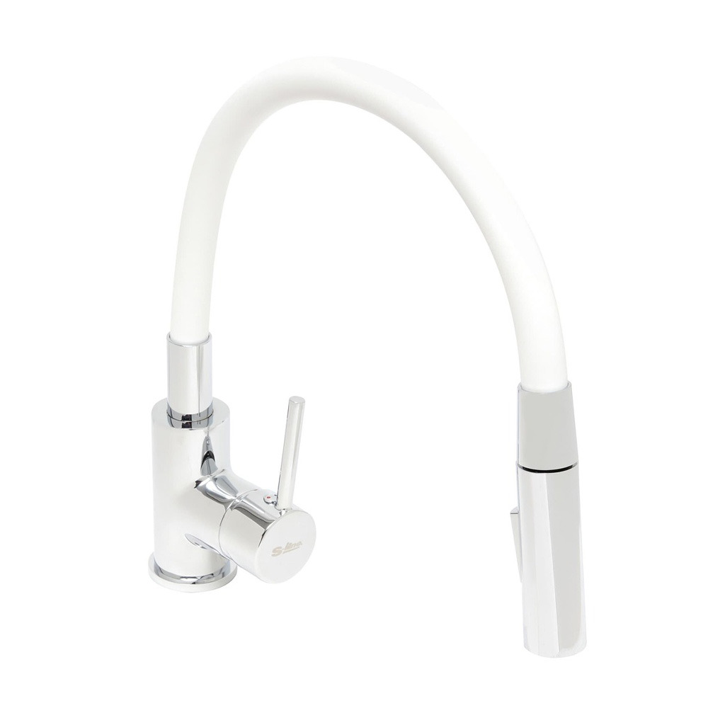 Caractéristiques du mitigeur cuisine à mémoire de forme, 2 types de jet mousseur ou douchette, courbe en silicone blanc (SIKOBSLPRO290B2F):