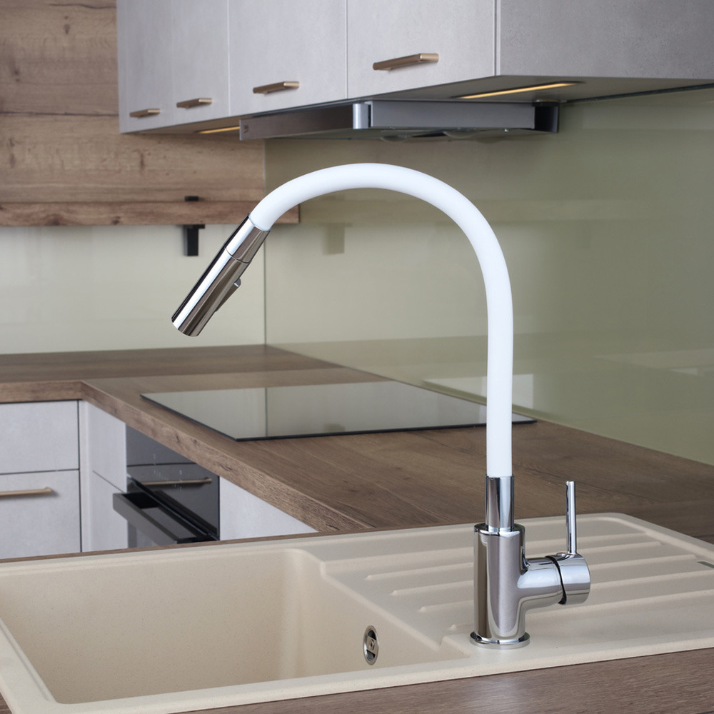 Siko mitigeur cuisine à mémoire de forme, 2 types de jet mousseur ou douchette, courbe en silicone blanc (SIKOBSLPRO290B2F)