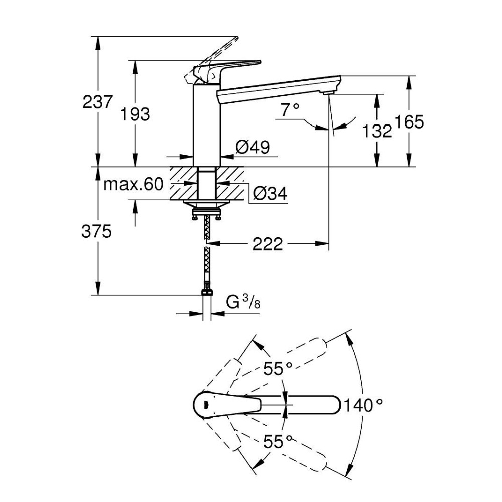 Caractéristiques du mitigeur d’évier 1/2", chrome Grohe BauEdge (G31693000) :