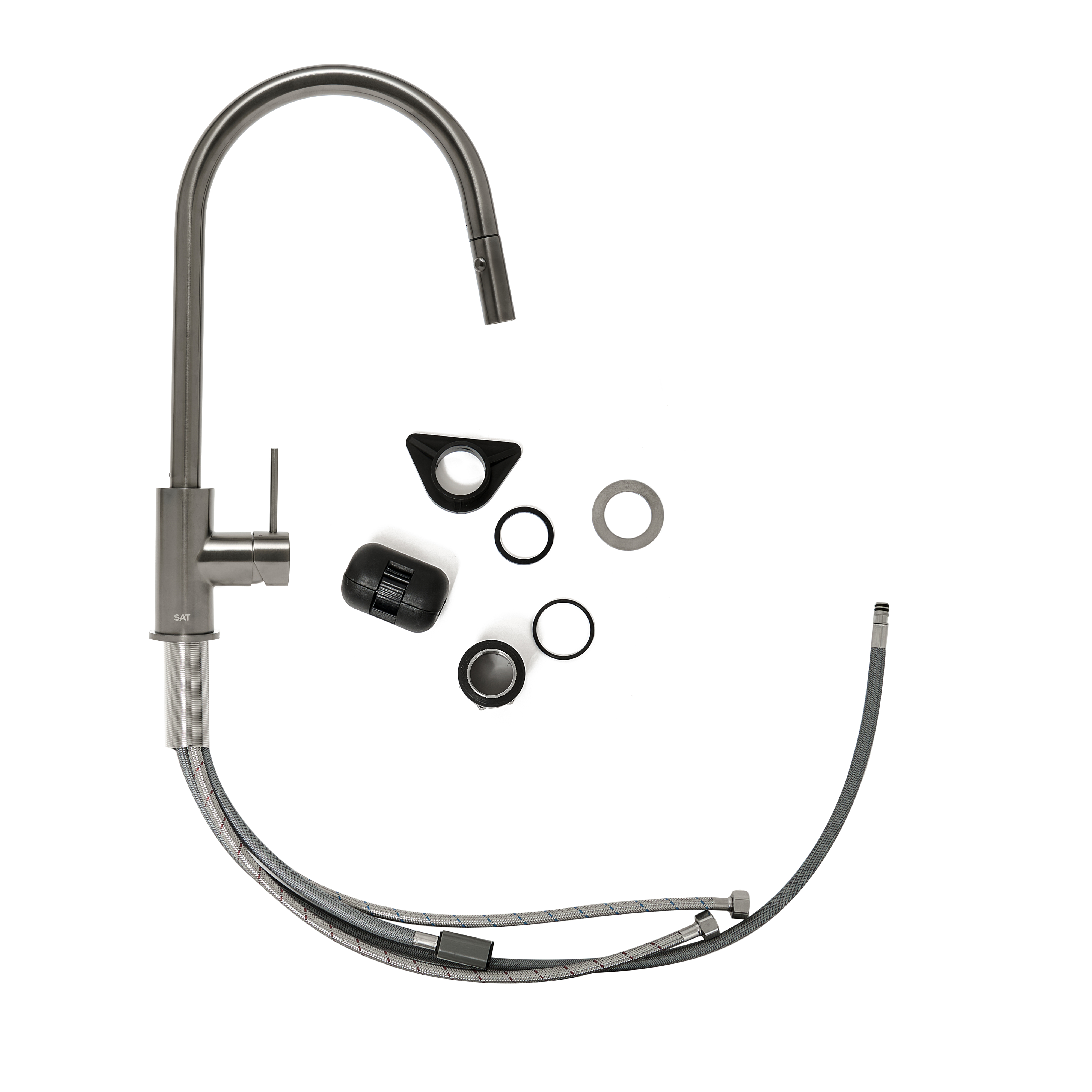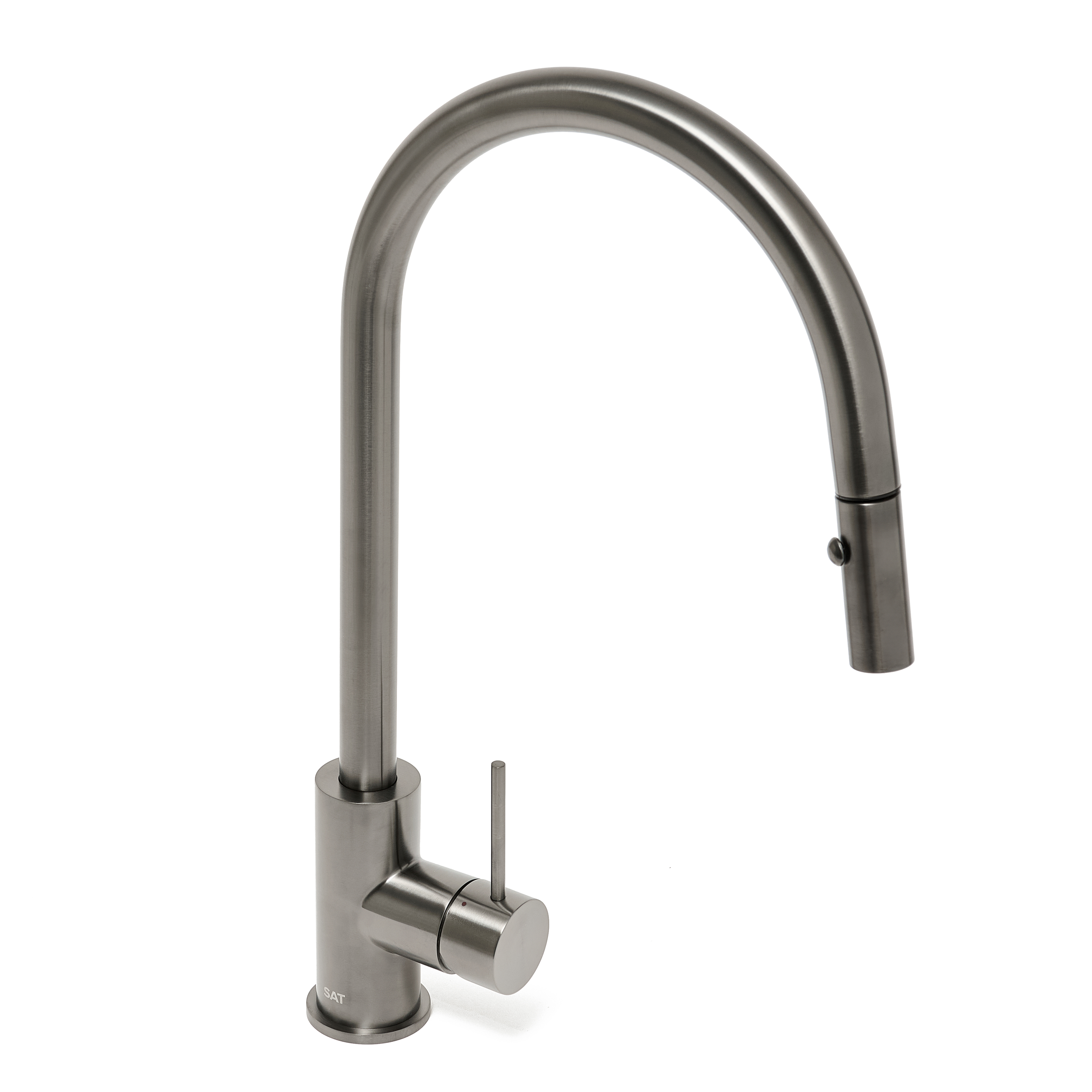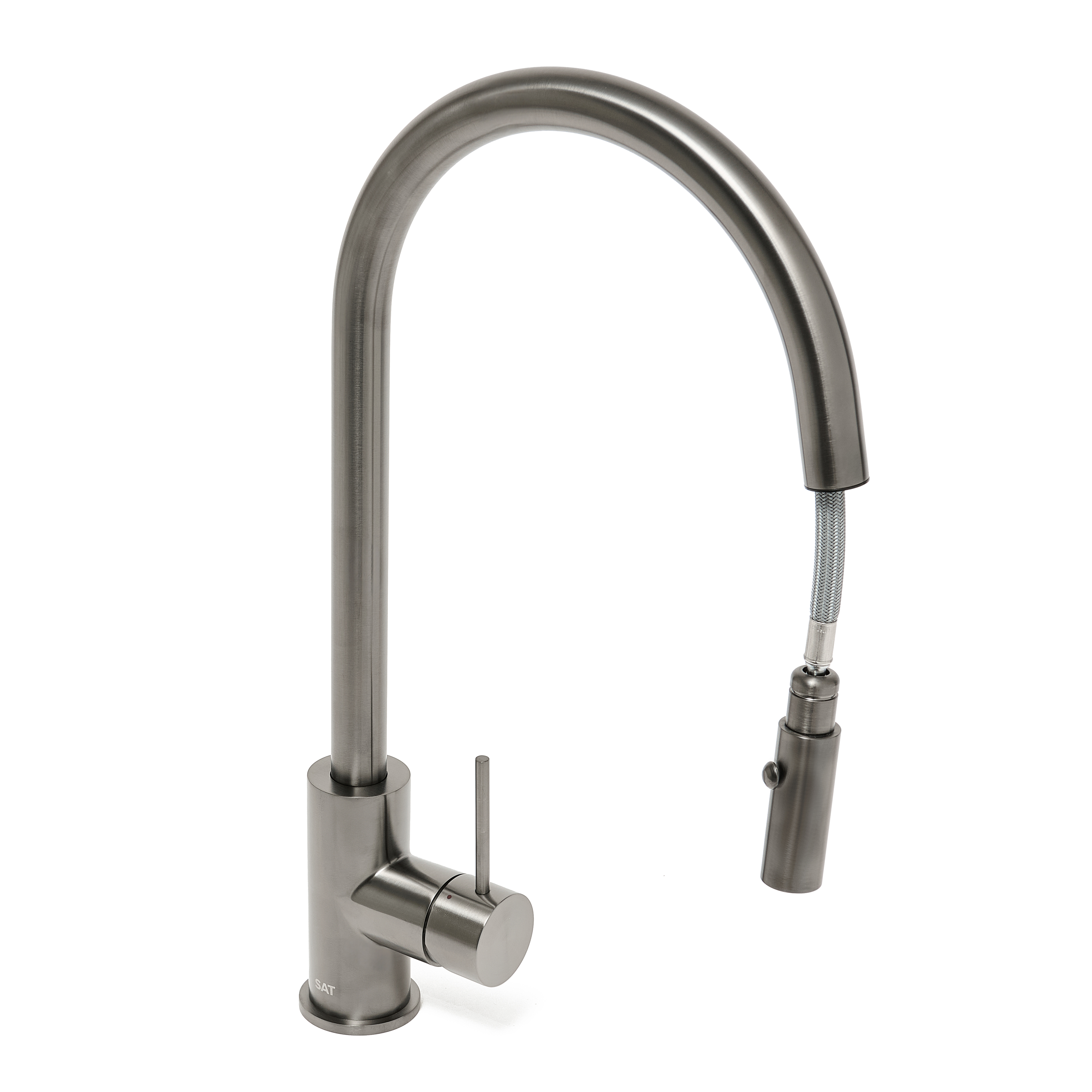 Caractéristiques du mitigeur évier à levier sur pied 44 cm avec douchette extractible 2 jets, Swiss Aqua Technologies (SAT) Aurum, métal brossé (SATBAUR286BGM) :