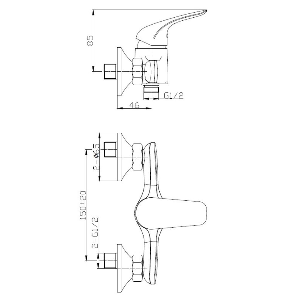 Mitigeur de douche mural à levier sans ensemble de douche. En VOVO. Distance entre les robinets 150 Mp. Avec finition SAT.